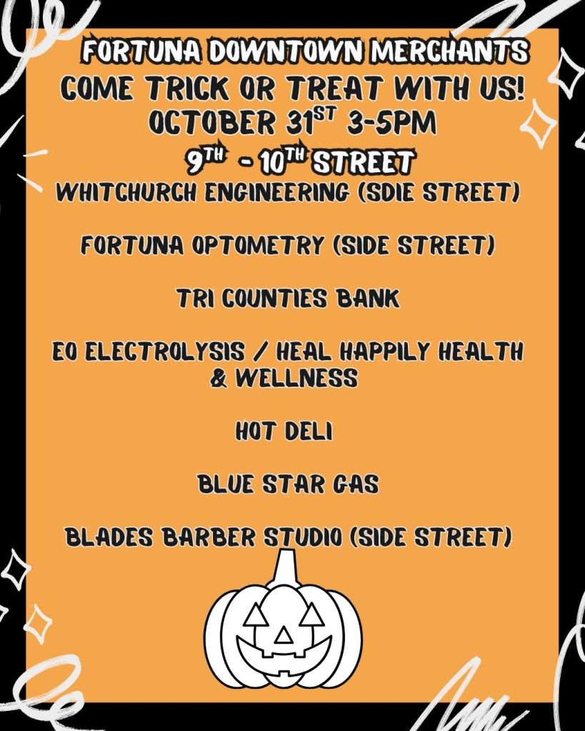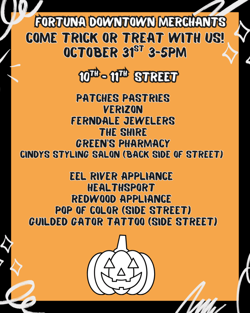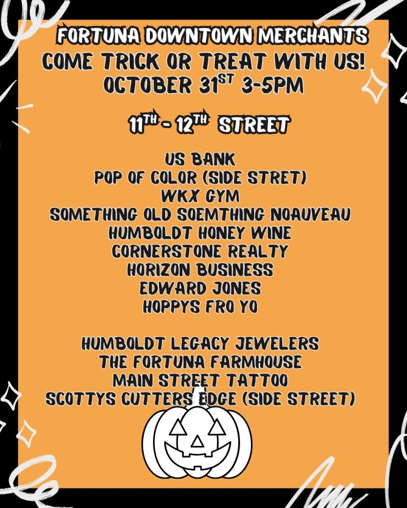 Downtown Fortuna Businesses and organizations opening their business for Trick or Treating to the community! Participants hand out candy to kids this year on October 31st from 3-5pm.